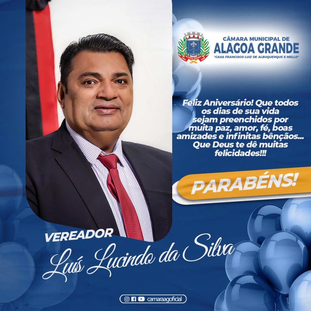 É com alegria que celebramos o aniversário do Vereador Luís Lucindo da Silva. Receba os Parabéns e a Homenagem de todos que fazem a Câmara Municipal de Alagoa Grande.