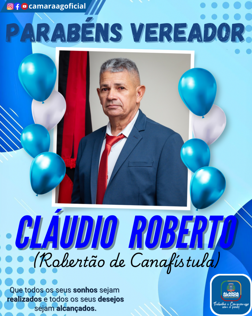 Meus parabéns! Que Deus esteja sempre no comando da sua vida e te abençoe nesta nova idade. Feliz aniversário! São os Votos de todos que fazem parte da Câmara Municipal de Alagoa Grande - PB.