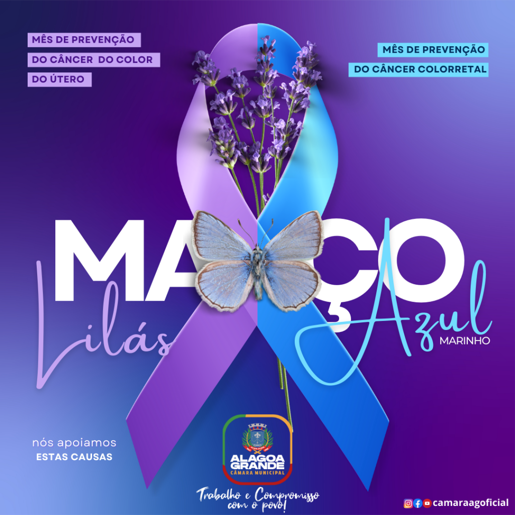 O Lilás e o Azul-Marinho são as cores da campanha do mês de março que alertam para a atenção aos cuidados e prevenção do câncer do colo do útero e do colorretal. Considerada a quarta causa de morte de mulheres por câncer no Brasil, o câncer de colo de útero é o terceiro tumor mais frequente na população feminina. O câncer colorretal é o terceiro câncer mais comum entre homens e mulheres no país.