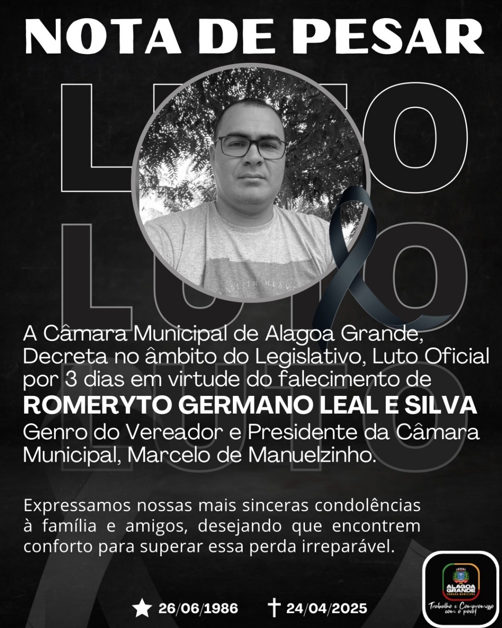 A Câmara Municipal de Alagoa Grande Decreta Luto Oficial de 3 dias, no âmbito do legislativo, em virtude do falecimento do senhor Romeryto Germano Leal e Silva, Genro do Presidente da Câmara Municipal, o Vereador Marcelo de Manuelzinho.