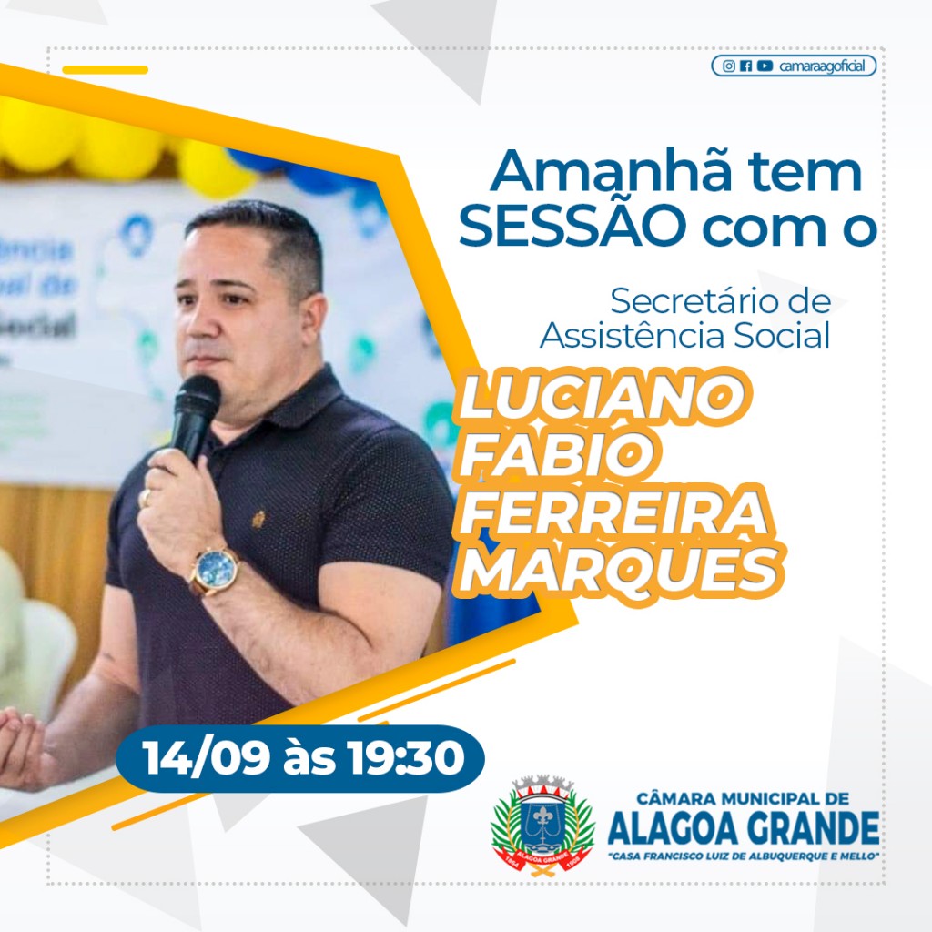 A Câmara Municipal de Alagoa Grande realizará amanhã terça(14), uma Sessão Especial com o Secretário de Assistência Social o Sr. LUCIANO FABIO FERREIRA MARQUES, na ocasião será exposto uma explanação das ações já realizadas pela Secretaria.